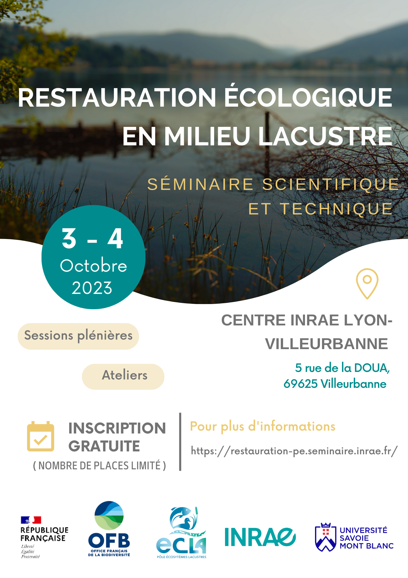 Nous avons le plaisir de vous informer de l'ouverture des inscriptions au séminaire "Restauration écologique en milieu lacustre" qui se tiendra les 3 et 4 octobre 2023 au centre INRAE de Lyon-Villeurbanne !