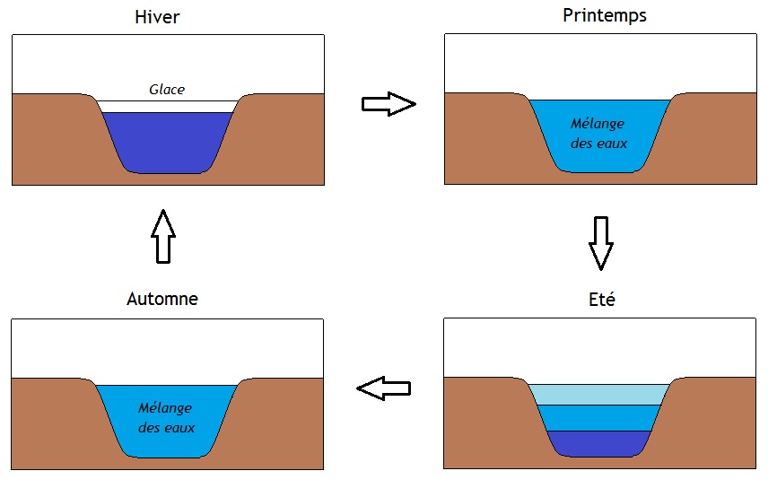 La stratification thermique des lacs Les couches d’eau se stratifient selon leur température : l’eau chaude étant plus légère que l’eau froide, une couche superficielle d’eau chaude (épilimnion) se met en place au printemps et en été, et « flotte » au-dessus d’une couche d’eau de fond plus froide (hypolimnion). La zone de transition entre ces couches d’eau s’appelle le métalimnion. La surveillance de la température à différentes profondeurs permet aussi de surveiller les mises en place et changements de profondeur/épaisseur de ces trois couches d’eau et la date d’apparition (printemps) et de disparition (automne) de la stratification. | ![]() |